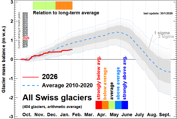 Berechneter, kumulativer Verlauf der schweizweiten Massenbilanz des laufenden Jahres bis zum aktuellen Datum im Vergleich zur Referenzperiode 2010-2020.